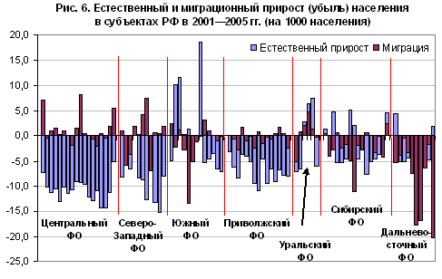 Рис. 3 - Естественный и миграционный прирост (убыль) населения в субъектах РФ в 2001–2005 гг. (на 1000 населения)