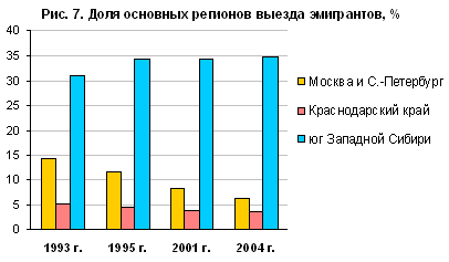 На фоне мало меняющейся с начала 2000-х гг. структуры эмиграции по регионам выезда обращает на себя внимание продолжающееся сокращение доли столиц. Эмиграцию из крупнейших городов обычно связывают с "утечкой мозгов", отъездом образованной молодежи. Однако официальная статистика показывает, что в возрастной структуре эмигрантов из федеральных городов повышена доля не молодежи, а пенсионеров, которые оформляют выезд на ПМЖ (26-28% при средней доле среди всех эмигрантов 14-15%). Среди выбывших из России половину составляет люди, эмигрировавшие в страны Западной Европы, США и Канаду. Они претендуют за рубежом не на убежище, а на более продуктивное применение имеющихся у них социальных и профессиональных ресурсов. Об этом свидетельствуют материалы социологических опросов, проведенных в разные годы Социологическим центром РАГС по репрезентативной общенациональной выборке, характеризующие распространенность эмиграционных настроений среди различных социальных групп российских граждан.