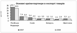 Порівняно з 2007р. збільшився експорт товарів до найбільших країн-партнерів: Сполучених Штатів Америки – на 84,2% (за рахунок збільшення поставок чорних металів та виробів з них, продуктів неорганічної хімії), Польщі – на 42,8%, Білорусі – на 34,8%, Туреччини – на 27,1%, Російської Федерації – на 24,2%, Німеччини – на 11,7%, Італії – на 8,8%.