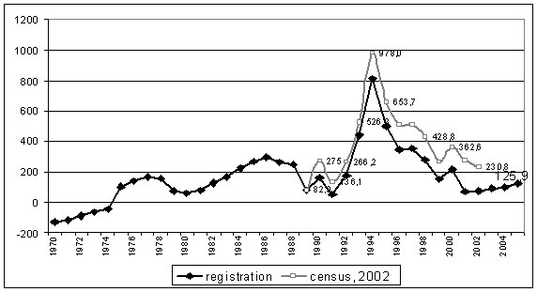 Согласно оценке, проведенной Росстатом, миграционный прирост населения, между переписями, за 1989 и 2002 гг., составил 5,6 млн человек. Это в 2,3 раза больше, чем за аналогичный по продолжительности предшествующий период. В последние годы происходило быстрое снижение миграционного тренда, после того как в 1994 г. он достиг максимума (Рис. 6). Нисходящий миграционный тренд и огромное количество незаконных мигрантов находится в явном противоречии с потребностью страны в мигрантах, свидетельствуя о несостоятельности проводимой миграционной политики.