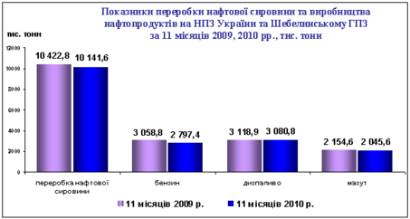 Виробництво бензинів за січень – листопад 2010 року порівняно із відповідним періодом 2009 року зменшилось на 261,4 тис. тонн (або на 8,5%); дизельного пального – зменшилось на 38,1 тис. тонн (або на 1,2%) та мазуту – на 109,0 тис. тонн (або на 5,1%) менше.