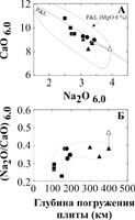 Планк и Лангмюр [24] показали, что степень плавления под активными островными дугами зависит от мощности мантийного клина и выражена в отрицательной корреляции между Ca6,0 и Na6,0 от фронта дуги к тылу. Причина такой корреляции в том, что Ca удерживается клинопироксеном в мантии, а Na - нет. В случае Камчатского пересечения такой тренд должен быть очевиден, поскольку глубина сейсмофокальной зоны увеличивает в 4 раза от ВВФ к СХ. Это мы и наблюдаем на диаграмме CaO6,0 - Na2O6,0 (рис.11A), где наши данные полностью совпадают с трендом [24]. (Na2O/CaO)6,0 прогрессивно растет от ВВФ к ЦКД и далее остается постоянным к СХ (рис.11Б). Наивысшие значения Na6,0 найдены в породах ВПТ, что свидетельствует в пользу низких степеней плавления мантии в источнике этих пород. Следуя расчетам [24], породы ВВФ имеют наивысшую степень плавления - 20%. Более низкая степень плавления (9-12%) типична для лав ЦКД и СХ. Сходные оценки были получены и при сравнение разных групп несовместимых микроэлементов [9]. Отсутствие зависимости степени плавления от глубины погружения океанической плиты между ЦКД и СХ можно объяснить в рамках двухстадийной модели Пирса и Паркинсона [23]. На первой стадии плавление инициируется поступлением флюида в мантию, что может быть особенно важно для нашего З-В пересечения в связи с высвобождением больших объемов флюида при субдукции подводного Императорского хребта под Камчатку. Вторая стадия является результатом декомпрессионного плавления при уменьшении плотности обводненной мантии и процесса внутридугового спрединга, проявленного в настоящее время в ЦКД.