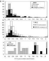Поскольку отношения несовместимых микроэлементов практически лишены влияния различных степеней плавления и фракционирования, они являются полезным инструментом в изучении процессов обогащения мантии. Миллер и др. [20] показали, что Ce/Pb отношение отражает степень обогащения расплава флюидом, потому что Pb высоко подвижен в нем, но в процессах плавления и кристаллизации ведет себя подобно Ce. В породах Камчатского пересечения нет никакой систематической зависимости Ce/Pb отношения от глубины поверхности субдуцируемой плиты, оно приблизительно постоянно (4-6) во всех трех регионах, только лавы Кизимена из ВВФ и ВПТ Срединного хребта имеют повышенные Ce/Pb значения, предполагая меньшую флюидную добавку в мантийные источники. При детальном рассмотрении поведения La и Pb (рис.5Г,Д), очевидно, что эти отклонения вызваны низкими содержаниями Pb. Это подтверждается также постоянным Ba/Zr отношением (рис.6Е). Эти результаты были так же подтверждены и количественными расчетами [9].