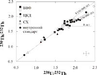 Значительное 238U-230Th изотопное неравновесие с относительным обогащением U над Th, типичное для ряда островных дуг и интерпретируемое как результат добавки относительно молодого (<350 тыс. лет) флюида к мантийному источнику, не найдено в породах ВВФ и СХ, большинство фигуративных точек лежит на линии равновесия или очень близко к ней. Однако, наблюдается слабое обогащение (до 12%) U над Th для пород ЦКД.
