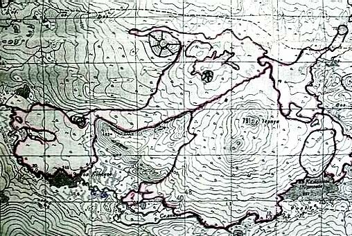| Рисунок 1. Топографическая схема района г. Терпук. На схеме обозначены лавовые потоки. Масштаб 1 : 100 000. Предоставлена О.В. Дирксеном (август 2002 года). |