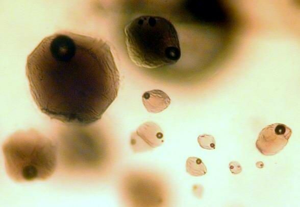 В зернах оливина из образца ПК 02/20 расплавные включения в основной своей массе представляют стекловатые области нередко с газовыми пузырьками размерами от 10 до 300 микрон. Морфологически можно выделить два типа включений. Первый тип под оптическим микроскопом отличается вытянутыми, каплевидными формами, коричневой окраской, частым присутствием газового пузырька. Второй тип включений обладает более изометричными округлыми формами, светлой прозрачной окраской, отсутствием газового пузырька (см. фотографию 9). Первый тип включений находился во всех изученных зернах. Часто эти включения формируют небольшие 5-10 шт. группы, хотя и встречаются отдельные экземпляры. Присутствует несколько включений с очень большими газовыми пузырьками, занимающими до 80% объема включения. Включения второго типа найдены только в некоторых зернах. Не обнаружено таких многочисленных скоплений этих включений в отличие от первого типа.