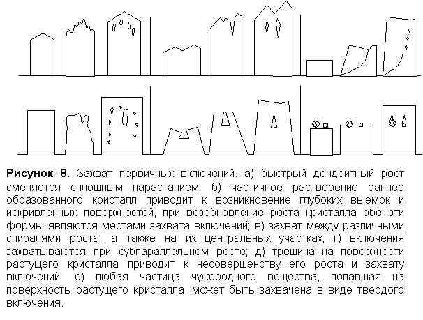 Расплавные включения представляют собой участки расплава, захваченные и законсервированные кристаллом в процессе роста или перекристаллизации из-за различных дефектов структуры поверхности (рис. 8). В первую очередь, для образования расплавных включений необходим расплав. Для того, чтобы произошел захват расплавного включения необходим дефект на фазовой границе кристалл-расплав. Наличие дефекта является основным условием образования расплавных включений.
