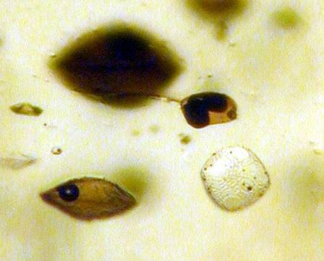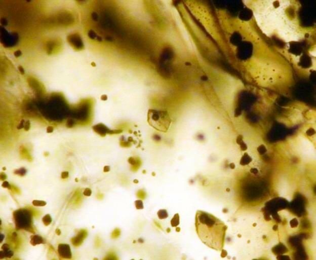 | Фотография 11. Фотография под оптическим увеличением x25 зерна 15 из образца ПК 02/27, представлен участок поверхности кристалла оливина. На снимке видно, что в кристалле оливина присутствуют расплавные включения (центр снимка и нижний правый угол) и многочисленные мелкие включения шинели, хаотично разбросанные по всему зерну. |