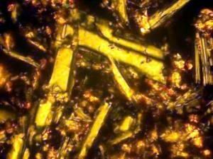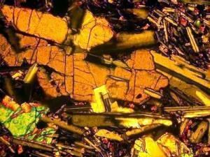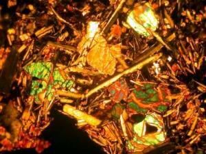 | Фотография 6. На снимке изображена часть поверхности шлифа ПК 02/20. Изображение получено с поляризационного микроскопа Option со включенным анализатором и объективом x40. На снимках хорошо видны фенокристаллы оливина и плагиоклаза, на правом снимке представлены оливин плагиоклазовые срастания, в большой кристалл оливина врастают кристаллы плагиоклаза. |