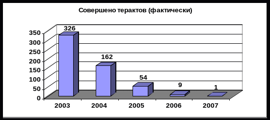 В современном российском обществе наибольший общественный резонанс вызывают террористические акты, поэтому правоохранительными органами уделяется значительное внимание профилактике именно этих преступлений. Принятыми правоохранительными органами мерами удалось добиться значительного снижения количества терактов на территории Чеченской Республики (на 96,0%). Число фактически совершенных терактов (без учета преступлений прошлых лет) снизилось с 326 преступления в 2003 году до 1 преступления в 2007 году (см. рис. №10).