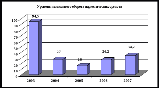 Так если в 2003 г. уровень данных преступлений составлял 94,5, в 2005г. – 16,0, то в 2007 г. – 34,2. В целом в 2007 г. по отношению к 2003 г. отмечалось сокращение на 63,8%. В борьбе с данным видом преступности подразделениями органов внутренних дел Чеченской Республики принимались меры, направленные на перекрытие каналов поступления наркотиков, выявление наркосбытчиков, преступных групп, занимающихся незаконным оборотом наркотических средств, других тяжких преступлений по данной линии. В результате в истекшем году выявлено 737 (+27,5%) преступлений, связанных с незаконным оборотом наркотиков (+27,5%). Из них 596 преступлений было раскрыто (+17,6%). Из незаконного оборота изъято 126,0 кг наркотиков (40,7 кг за 2006 г.), в том числе: 125,1 кг – марихуаны, 211 г – гашиша, 82 г – опия, 96 г – ацетилированного опия, 54 г – сильнодействующих и психотропных веществ, 46 г – героина.