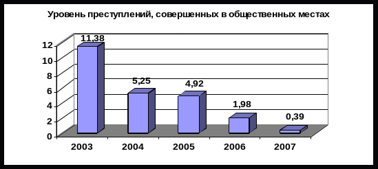 Так, если в 2003 г. уровень преступлений, совершенных в общественных местах составлял 96,78, то к 2007 году – 2,20. Таким образом, с 2003 г. снижение данных преступлений составило -97,7%. В целом, в последнее время наметились позитивные тенденции «уличной» преступности.