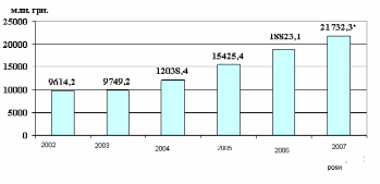 Рис. 1. Динаміка обсягів річних доходів Пенсійного фонду України за період 2002-2007 р.р.