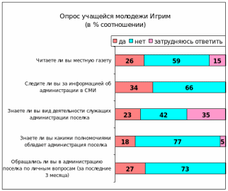 В результате анализа проведенного опроса среди учащейся молодежи Игрима (опрошено 100 человек) (приложение 2) выяснилось, что наша молодежь мало знает о деятельности Администрации городского поселения И