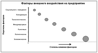 На рисунке 3 приведены результаты предварительной оценки степени влияния основных факторов внешнего воздействия на предприятие, полученные путем качественного анализа особенностей функционирования предприятий в условиях стабильной внешней и внутренней среды. Необходимо отметить, что степень влияния факторов внешнего воздействия на предприятие в значительной мере определяется типом внешнего окружения, видом выпускаемой продукции, принятыми управленческими решениями.