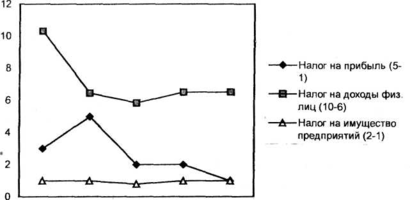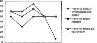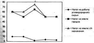 На этих рисунках мы видим динамику изменения ставок налога на прибыль, налога на доходы физических лиц, налога на имущество предприятий (рис. З, 4), а также нормативов отчислений от сборов налога на добычу углеводородного сырья, налогов на землю городов и землю сельскохозяйственного назначения (рис.3, 4), назначавшихся республиканскими законами о бюджете упомянутым местным бюджетам в 2001-2005 годы. Графики с очевидностью показывают, что нормативы отчислений менялись в значительных размерах от года к году в течение 2001-2004 г.г. Особенно сильно колебались нормативы отчислений от налога на прибыль, налога на доходы физических лиц и налога на добычу сырья - налогов, которые приносят наибольшие суммы доходов в консолидированный бюджет региона, как это видно из рис.5 (налоги на добычу сырья составляют основную часть налогов на минеральные ресурсы).