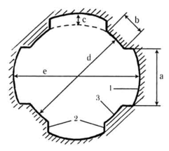 1 — дно нареза; 2 — грани нареза; 3 — поле нареза (а — ширина нареза, b — ширина поля нареза, с — глубина нареза, d — диаметр канала ствола по полям (калибр), е — диаметр канала ствола по нарезам)