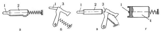 а — ударниковый; б — курковый; в — курково-ударниковый; г — затворный (1 — боек, 2 — ударник, 3 — курок, 4 — затвор)