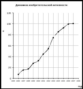 | Рост общего количества патентов во времени (кумулятивный динамический ряд) | 7 | 15 | 17 | 27 | 32 | 44 | 54 | 74 | 85 | 92 | 99 | 100 | |