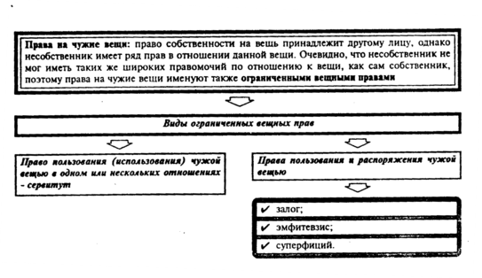 Сервитутные права (сервитуты), состоявшие в праве одного лица пользоваться (в каком-нибудь определенном отношении или нескольких отношений) вещью, принадлежащей другому лицу. К правам на чужие вещи относились также эмфитевзис и суперфиций (права вещного наследственного пользования чужой землей или строением на чужой земле) и, наконец, залоговое право, которое устанавливалось в обеспечении платежа по какому-нибудь обязательству, обеспеченному залоговым правом, обратить взыскание на залоговую вещь0.