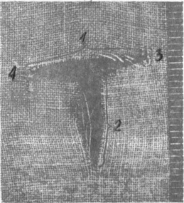 Рис. 2. Колото-резаное повреждение от действия однолезвийного клинка:1-основной разрез; 2-дополнительный разрез; 3-обушковый конец Т-образной формы; 4-лезвийный конец.