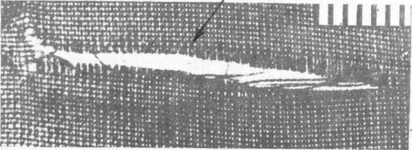 Дополнительный разрез отходит от основного обычно под некоторым углом, но иногда является его продолжением. В месте перехода основного разреза в дополнительный нередко обнаруживают надрез поперечной нити либо продольно расположенную полностью пересеченную нить, которая в просвете основного разреза выглядит в виде уступа (см. рис. 4):
