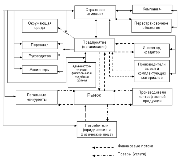 Согласно статье 211 Гражданского кодекса Российской Федерации риск случайной гибели или случайного повреждения имущества несет его собственник. При управлении объектами государственной собственности российской государство как собственник имущества несет на себе риски, связанные с владением, пользованием и распоряжением этой собственностью. На рисунке 3 представлена принципиальная схема объектов и субъектов страхования для предприятий и организаций.