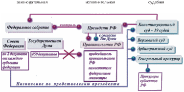 Таким образом, рассмотренные нами характеристики форм современного российского государства указывают, что, не смотря на сложности в реформировании Российского государства, нет крутых революционных перемен. Речь идет о неизбежном для любой социальной системы развитии. С точки зрения характера распределения власти и взаимоотношения политической системы и общества в России существует скорее всего развивающаяся демократическая система, особенностью которой является сосредоточение власти в едином центре, каковым является президент и его администрация. Поле деятельности представительных органов власти ограничено. Обнаруживается плюрализм в разделении властей в государстве, многопартийности, передачи ряда законодательных и исполнительных полномочий от центра субъекта федерации.