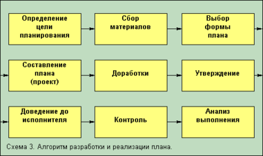 Планы рассматриваются на заседаниях постоянных депутатских комиссий или совещаниях исполнительных органов власти, утверждаются и направляются исполнителям. Для того чтобы план отвечал всем требованиям и выполнялся, необходимо использование специальной методики разработки плана и его реализации. Ее можно охарактеризовать с помощью схемы 3.