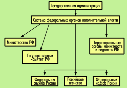 Систему федеральных органов исполнительной власти составляют федеральные министерства РФ и иные федеральные органы исполнительной власти: государственные комитеты Российской Федерации, федеральные службы России, российские агентства, федеральные надзоры России, а также Управление делами Президента Российской Федерации.