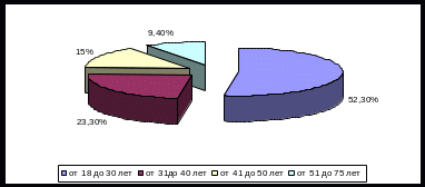 Возраст опрошенных составил от 18 до 75 лет. Основное количество респондентов находится в возрастной категории от 18 до 30 – 52, 3 % (56 человек); от 31 до 40 лет – 23,3% (25 человек); от 41 до 50 лет – 15% (16 человек), от 51 до 75 лет – 9,4 % (10 человек)(рис.2):