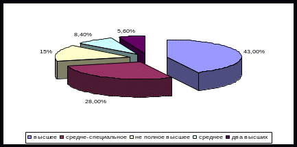 Как показало исследование, 43% опрошенных (46 человек) имеют высшее образование, средне – специальное 28% (30 человек), не полное высшее 15% (16 человек), среднее образование имеют 8,4% (9 человек) и два высших образования имеют 5,6% (6 человек)(рис.3):