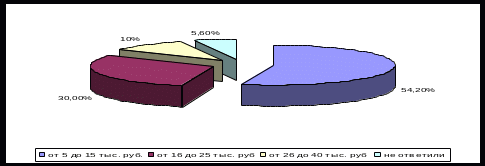 Наибольшее количество респондентов имеют средний уровень дохода на одного члена семьи в месяц от 5 до 15 тысяч рублей – 54,2% (58 человек); от 16 до 25 тысяч рублей имеют 30% респондентов (32 человека); от 26 до 40 тысяч рублей средний ежемесячный доход имеют 10,2% респондентов (11 человек); и предпочли не отвечать на этот вопрос 5,6% опрошенных (6 человек) (рис. 6):