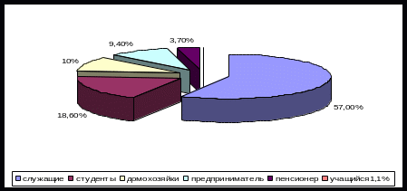 По социальному статусу опрошенных большую часть составляют служащие 57% (61 человек) и студенты 18,6% (20 человек); домохозяйки составляют 10,2% (11 человек); предприниматели 9,4%(10 человек); пенсионеры 3,7% (4 человека) и учащиеся 1,1% (один человек) (рис. 4):