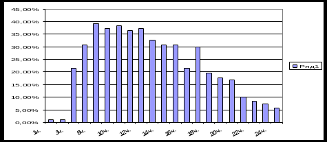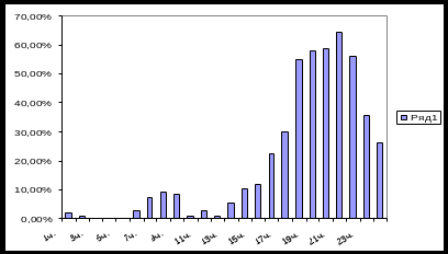 При ответе на вопрос: «В какое время Вы предпочитаете смотреть телевизор?» были получены данные, что в период с 19.00 до 23.00 местные телеканалы смотрят от 22,4% - до 64,4% опрошенных (24-69 человек) внешней аудитории ООО «РУСИНТЕРФАРМ», пик активности приходится на 22.00 часа в данное время телевизор смотрят 64,4% опрошенных (69 человек) (рис.13):