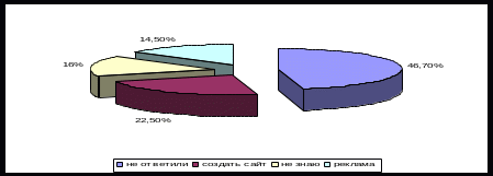 Так как пользователями Интернет являются 58% (62 человека) внешней аудитории ООО «РУСИНТЕРФАРМ», то при ответе на следующий вопрос: «Если «да», то что бы Вы посоветовали ООО «РУСИНТЕРФАРМ» для его улучшения?», это количество опрошенных будем считать за 100% . 22,5% опрошенных (14)человек предложили создать свой сайт; 14,5% (9 человек) предложили разместить рекламу в Интернет; дали ответ не знаю 16,3% опрошенных (10 человек); и 46,7% опрошенных (29 человек) не ответили на данный вопрос (рис. 15):