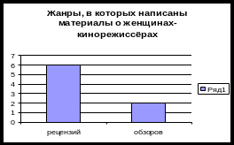 Всего нами было просмотрено двадцать номеров. В восьми из них содержались материалы о женщинах-кинорежиссёрах. В том числе: рецензий – шесть; критических обзоров – два. Эти факты мы отразили в нижеприведённых диаграммах.