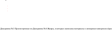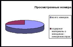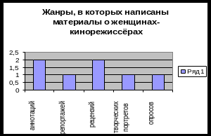 Материалы о женщинах-кинорежиссёрах содержались в семи из двадцати просмотренных номеров. В том числе: две аннотации, один репортаж, две рецензии, один творческий портрет, один опрос. Что так же отраженно в диаграммах.