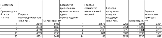 Расчеты производятся для 5 заданных величин среднегодовых тиражей изданий. Результаты представлены в таблице 2.1