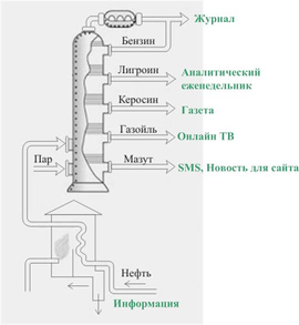 Таким образом, важные редакционные процессы сегодня можно обозначить словом дистрибуция – подготовка различных частей истории в тех качествах и свойствах, которые необходимы для той или иной платформы, и публикации этого контента на них. Другими словами, современная объединенная редакция подобна ректификационной колонне, где вместо сырой нефти используется входной событийный и информационный поток, который в процессе работы разделяется на фракции, от самых тяжелых (короткие новости, ответ на вопрос «что») до самых легких, качественных фракций (краткий, но ясный анализ и объяснения, зачастую в виде инфографики, ответ на вопрос «почему»). И, конечно, каждая из этих фракций истории публикуется на более подходящих, соответственно качеству, платформах (см. рис. 4).