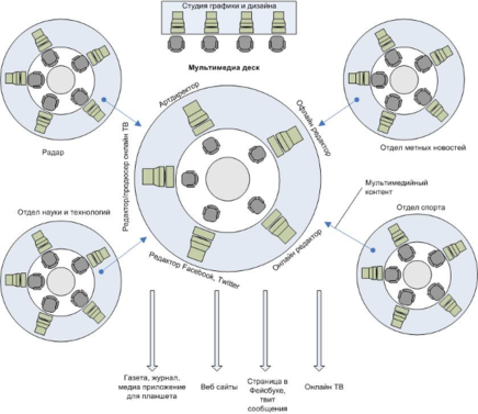 Подобная схема организации редакционного зала позволяет обеспечить мультиформатное освещение события. Эта система позволяет одновременно готовить справочную информацию по теме, подбирать архивные фотографии, писать наброски текста, готовить инфографику – все для освещения одной темы.