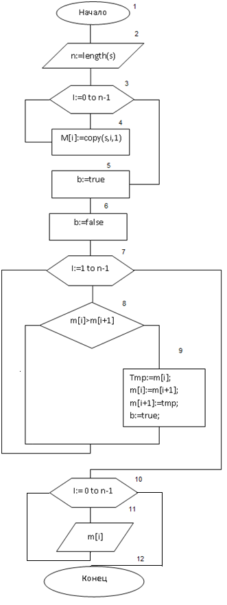 | 9 | Выполнение операции tmp:=m[i]; m[i]:=m[i+1]; m[i+1]:=tmp; b:=true |