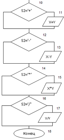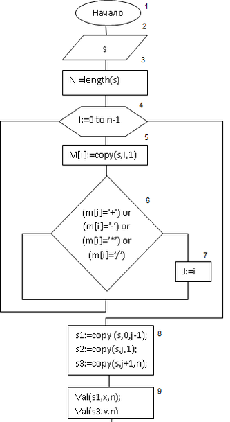 | 6 | Тело цикла, условие (m[i]=’+’) or (m[i]=’-‘) or (m[i]=’*’) or m[i]=’/’) |