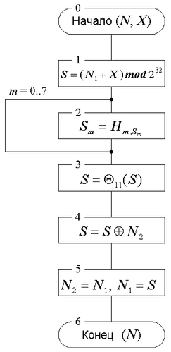Элементы данных обозначим заглавными латинскими буквами с наклонным начертанием (например, X). Через |X| обозначается размер элемента данных X в битах. Таким образом, если интерпретировать элемент данных X как целое неотрицательное число, можно записать следующее неравенство: 0 Если элемент данных состоит из нескольких элементов меньшего размера, то этот факт обозначается следующим образом: X = (X0, X1, ..., Xn-1) = X0||X1||...||Xn-1. Процедура объединения нескольких элементов данных в один называется конкатенацией данных и обозначается символом ||. Естественно, для размеров элементов данных должно выполняться следующее соотношение: |X|=|X0|+|X1|+...+|Xn-1|. Все алгоритмы шифрования ГОСТа опираются на три алгоритма низшего уровня, называемые базовые циклами. Они имеют следующие названия и обозначения: цикл шифрования (32-З); цикл дешифрования (32-Р); цикл выработки имитовставки (16-З). В свою очередь, каждый из базовых циклов представляет собой многократное повторение одной единственной процедуры. Назовем ее основным шагом криптопреобразования. Таким образом, чтобы разобраться в ГОСТе, необходимо понять три следующие вещи: что такое основной шаг криптопреобразования; как из основных шагов складываются базовые циклы; как из трех базовых циклов складываются все практические алгоритмы ГОСТа. Прежде чем перейти к изучению этих вопросов, следует поговорить о ключевой информации, используемой алгоритмами ГОСТа. Ключевая информация состоит из двух структур данных. Помимо ключа, необходимого для всех шифров, она содержит еще и таблицу замен. Ключ является массивом из восьми 32-битных элементов кода. Далее он обозначается символом К: Таблица замен является матрицей 816, содержащей 4-битовые элементы, которые можно представить в виде целых чисел от 0 до 15. Строки таблицы замен называются узлами замен, они должны содержать различные значения, то есть каждый узел замен должен содержать 16 различных чисел от 0 до 15 в произвольном порядке. Далее таблица замен обозначается символом H: 3.2.2 Основной шаг криптопреобразования Основной шаг криптопреобразования (рис. 1) по своей сути является оператором, определяющим преобразование 64-битового блока данных. Дополнительным параметром этого оператора является 32-битовый блок, в качестве которого используется какой-либо элемент ключа. Рис. 1. Схема основного шага криптопреобразования алгоритма ГОСТ 28147-89. Шаг 0. Определение исходных данных для основного шага криптопреобразования, где N –преобразуемый 64-битовый блок данных, в ходе выполнения шага его младшая (N1) и старшая (N2) части обрабатываются как отдельные 32-битовые целые числа без знака. Таким образом, можно записать N=(N1,N2), а X – 32-битовый элемент ключа. Шаг 1. Сложение с ключом. Младшая половина преобразуемого блока складывается по модулю 232 с используемым на шаге элементом ключа, результат передается на следующий шаг. Шаг 2. Поблочная замена. 32-битовое значение, полученное на предыдущем шаге, интерпретируется как массив из восьми 4-битовых блоков кода: S= (S0,S1,S2,S3,S4,S5,S6,S7). Далее значение каждого из восьми блоков заменяется на новое, которое выбирается по таблице замен следующим образом: значение блока Sm заменяется на Sm-ный по порядку элемент (нумерация с нуля) m-ного узла замен (т.е. m-ной строки таблицы замен, нумерация также с нуля). Другими словами, в качестве замены для значения блока 