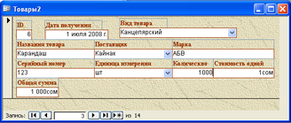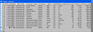 После завершения работы над моделью таблицы товары и ввода масок ввода для полей «Дата получения», «Стоимость одной единицы» и «Общая сумма» и заполнения таблицы информацией (не достоверной) получилось следующее (Рисунок 2.3.)