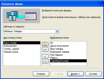 Так как мы уже имеем готовую таблицу «товары» создадим форму с помощью мастера. При нажатии на эту кнопку мастер создания форм предлагает вам выбрать таблицу из списка, для которой будет создаваться форма. После выбираем поля из таблицы, которые будут в форме (Рисунок 2.9.).