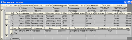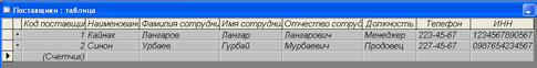 Таблица «поставщики» фигурирует почти во всем процессе работы над базой и наполнив его данными о двух поставщиках, поставщики канцелярских поваров и технического материала, получаем следующий вид (Рисунок 2.5.)