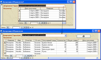 Создаем форму с помощью мастера, из таблицы департамент \ управление добавляем в выбранные поля, поле «департамент \ управление». Далее из таблицы получатели добавляем поля свыше указанной информацией. В результате продолжения мастер предлагает два варианта вывода данных «подчиненная форма » или «связанные формы». Для этого случая воспользуемся первым вариантом, но получившаяся форма не имеет поле со списком для поля департамент \ управление. Для этого открываем форму конструктором и меня поле с значением на поле со списком добавив в неё кнопку печати формы и получаем форму которая при выборе департамента выводить информацию об получателе этого департамента (Рисунок 2.12.).