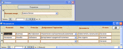Эта форма тоже будет создана таким же способом, что и предыдущая. Создадим форму с помощью мастера и выберем из таблицы товары поле «наименование», а с таблицы получатели почти все поля. Для демонстрации других возможностей Ms Access выбираем «связанные формы». Получаем форму и так же как и предыдущая форма меняем «поле со значением» на «поле со списком». Мастер автоматически создает форму в виде списка, которая выводить этот список после выбора товара и нажатия на кнопки «получатели». На экране это выглядеть следующим образом (Рисунок 2.13.).