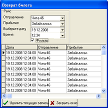 При возврате билета, оператор переходит на форму сдачи билета. На форме выбирается из ниспадающих списков станция отправления, назначения, дата и время рейса, после чего кассир ставит галочку фильтровать, и в таблице отобразятся все заказы, которые соответствуют критерию поиска.